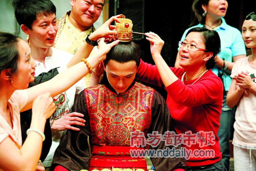 李少紅執(zhí)導(dǎo)的新版《紅樓夢》歷經(jīng)一年三個半月的緊張拍攝,終于在昨日殺青!皩氂瘛睏钛笠苍谶@一天迎來了自己的18歲成年生日。昨日,劇組殺青之日,導(dǎo)演李少紅與近百名演職人員一起,為“成年寶玉”楊洋舉行了熱鬧的成人禮。李少紅親手為楊洋摘下通靈寶玉,象征劇組正式殺青;隨后,李少紅又為楊洋戴上金冠,取意“加冠成人”(左圖)。楊洋感動得語帶哽咽:“18歲生日在劇組度過,我覺得很有意義。它對劇組的拍攝工作是一個圓滿的終點,但對于我個人來說,卻是人生新的起點!