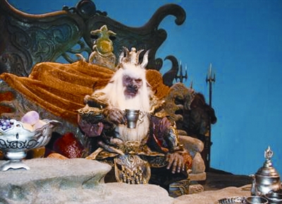 當記者來到攝影棚時,正在拍攝的場景是牛魔王殿前獨酌的一場戲,身為主角的唐僧師徒四人則不見蹤影,只見魁梧威嚴、黑臉白須的“牛魔王”端坐在寶座上,數(shù)十名青面獠牙的“小妖”分列兩旁。(周文韜)