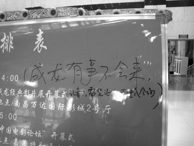 但有趣的是,記者們在電影節(jié)“指定酒店”的大堂信息欄發(fā)現(xiàn)了這樣一行大字:“成龍有事不會來。 ”記者們看后紛紛大笑,并用相機拍下了這個有意思的畫面,這句話也迅速成為記者圈內(nèi)的一句流行語。記者 于音