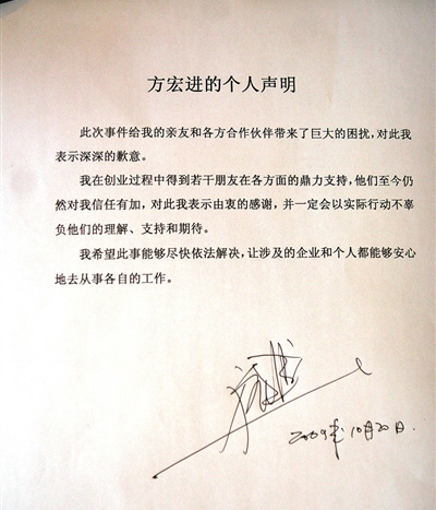 方宏進的聲明字數(shù)并不多,全文為打印字體,在文末空白處,方宏進簽上了自己的名字。一開頭,方宏進就道歉,“此次事件給我的親友和各方合作伙伴帶來了巨大的困擾,對此我表示深深的歉意!憋柺軤幾h的方宏進直言:“希望此事能夠盡快依法解決,讓涉及的企業(yè)和個人都能夠安心地從事各自的工作!