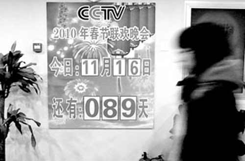 這個由紅色燈籠、黃紅相見的煙花裝扮的倒計時牌,格外喜慶。昨天,倒計時牌上顯示“CCTV2010年春節(jié)聯(lián)歡晚會今日:11月16日 還有:089天”。