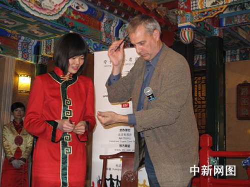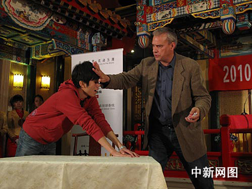 中新網(wǎng)11月25日電 昨天(24日),北京電視臺(tái)2010年“環(huán)球春晚”正式簽約美國(guó)著名魔術(shù)師大衛(wèi).威廉姆森儀式在北京全聚德烤鴨店舉行。和因春晚一炮而紅的劉謙一樣,來自美國(guó)的大衛(wèi)最擅長(zhǎng)近臺(tái)魔術(shù),被譽(yù)為是“魔術(shù)盛典靈魂人物”。在簽約儀式上,大衛(wèi)以他風(fēng)趣幽默的個(gè)人風(fēng)格和在場(chǎng)的魔術(shù)愛好者過招,在觀眾眼前近距離地用撲克牌和順手拿起的筷子展示了自己嫻熟的手法。