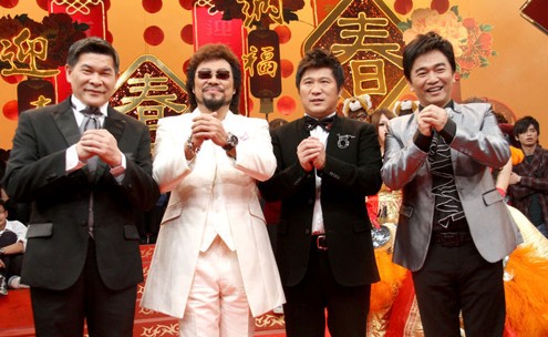前天,4位“大腕級”的臺灣“綜藝大哥大”張菲、胡瓜、吳宗憲和澎恰恰首度同臺,主持中視除夕特別節(jié)目“虎年旺旺慶團圓”。4人進棚錄像,大伙笑稱是“四大天王”。張菲和胡瓜師徒2人曾在去年莫拉克風災后,共同主持公益慈善晚會,但4人同臺主持還是首例。