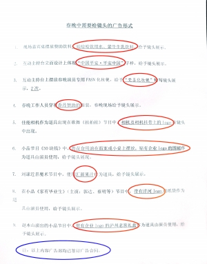 在清單里能看到的部分內(nèi)容包括,“現(xiàn)場嘉賓桌擺放贊助飲料娃哈哈飲用水、蒙牛牛乳飲料,給予鏡頭展示”;“互動主持臺立面設(shè)計(jì)上體現(xiàn)‘中國平安·平安中國’字樣,給予鏡頭展示”;“春晚工作人員穿著喬丹贊助的服裝,春晚現(xiàn)場給予鏡頭展示”;“佳能相機(jī)作為道具出現(xiàn)在歌舞《拍拍拍》節(jié)目中,相機(jī)及相機(jī)掛帶上的logo在鏡頭中出現(xiàn)”;“小品節(jié)目《50塊錢》中,魯花食用油在面案或小桌上擺放,貼有企業(yè)Logo的圍裙作為道具由演員使用,給予鏡頭展現(xiàn)”;“劉謙近景魔術(shù)節(jié)目中,使用匯源果汁作為道具,給予鏡頭展示”;“趙本山演出的小品節(jié)目中帶有企業(yè)的logo的瀘州老窖禮盒作為道具由演員使用,給予鏡頭展示!