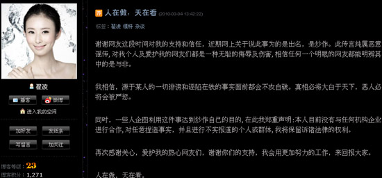 2月25日,“獸獸”翟凌利用博客發(fā)表聲明,就“艷照門”事件及相關(guān)不雅視頻在網(wǎng)絡(luò)上瘋傳一事進行公開表態(tài)。