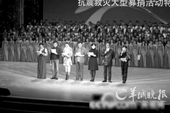 昨晚8時,《情系玉樹 大愛無疆———抗震救災(zāi)大型募捐活動特別節(jié)目》在中央電視臺現(xiàn)場直播,約有300名來自內(nèi)地和港、澳、臺地區(qū)的老藝術(shù)家、體育明星、戲曲歌唱演員參與演出。與普通的晚會不同,這次央視將節(jié)目現(xiàn)場與新聞現(xiàn)場串聯(lián),按照震后的時間順序,穿插救援畫面,再現(xiàn)了震區(qū)每天發(fā)生的感人事件,突出了節(jié)目的紀實性。
