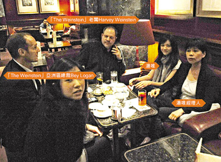 4月12日,湯唯與經(jīng)紀(jì)人及助手在香港中環(huán)文華東方酒店與“韋恩斯坦”老板Harvey Weinstein會面。現(xiàn)場所見,湯唯的英語非常流利。發(fā)現(xiàn)記者后,她面帶笑容,表現(xiàn)得體。在場的亞洲區(qū)總裁Bey Logan事后表示,Harvey Weinstein對湯唯大為贊嘆。Bey Logan說:“那天我們和湯唯只是一次很簡單的聚會,主要是想先了解一下她。她是一個不可多得的人才,會講廣東話、普通話和英文,很不錯!眴柕绞欠褚延泻萌R塢導(dǎo)演邀湯唯合作,他說:“一定有啦!如果有適合的角色,我們肯定會找湯唯!