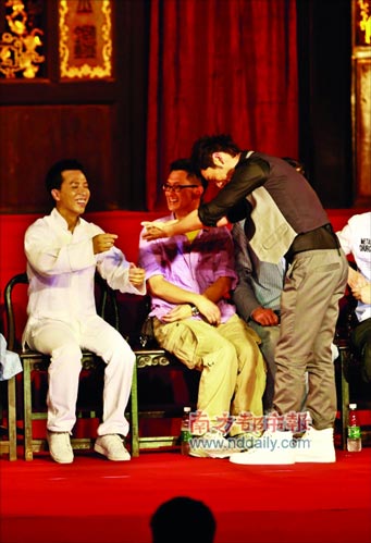 甄子丹當日以一身白色功夫裝亮相,在隨后的發(fā)布會,眾多媒體見證了他一次收下黃曉明、釋小龍和蔣岱言三位徒弟!昂_x”出來的“小李小龍”蔣岱言現(xiàn)場耍雙截棍,還虎虎生威地打了一套拳。之后,黃曉明等三人一起向甄子丹敬茶致禮,場面十分溫馨。黃曉明說自己今后將多拍“打戲”,但有記者問:“你怎么一把年紀了才來學武術?”黃曉明笑言:“活到老學到老啦。男人應該都會點功夫,有強壯的體魄,才能保護女人!”