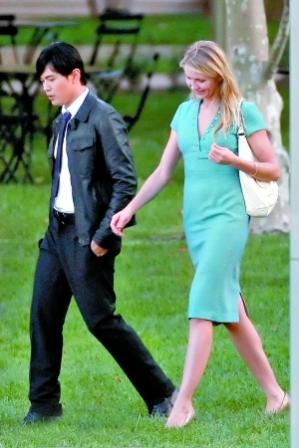 美國當(dāng)?shù)貢r間9月5日,周杰倫在洛杉磯拍攝電影《青蜂俠》。好萊塢影星卡梅隆·迪亞茲身穿藍(lán)色連衣裙,與周杰倫邊走邊聊,非常親密。