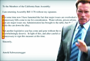 湯姆·阿米阿諾與幾位議員提出了一項(xiàng)法案,希望加州能在舊金山地區(qū)創(chuàng)建基礎(chǔ)設(shè)施融資區(qū),采取融資計(jì)劃推動(dòng)這些地區(qū)的基礎(chǔ)設(shè)施建設(shè)。通常此類(lèi)法案如果不是問(wèn)題太多的話(huà),州長(zhǎng)會(huì)予以批準(zhǔn)。但湯姆·阿米阿諾與施瓦辛格素來(lái)看不對(duì)眼,本月初又在集會(huì)上批評(píng)施瓦辛格的施政方式,還大罵他是“騙子”。施瓦辛格否決了這項(xiàng)提案,并在否決信上以藏頭詩(shī)的形式對(duì)阿米阿諾議員予以反擊,即信件每行第一個(gè)字母連起來(lái)就是“T(Tom),I f k you,A(Arnold Schwarzenegger)”。州長(zhǎng)辦公室新聞發(fā)言人稱(chēng)此事純屬巧合,“試想每天寫(xiě)那么多否決信,這種巧合的出現(xiàn)是遲早的事!