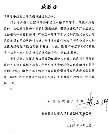 前不久有網(wǎng)友爆料李宇春的照片出現(xiàn)在了重慶市石柱縣龍沙鎮(zhèn)的計(jì)劃生育公益宣傳畫上,同時(shí)還打出“生男生女一樣好”的口號(hào)。天娛傳媒隨即指出此舉侵犯了李宇春的肖像權(quán)和名譽(yù)權(quán)。如今這張宣傳畫已經(jīng)被撤除,龍沙鎮(zhèn)人口和計(jì)劃生育辦公室還專程連同廣告公司一起向李宇春發(fā)出“致歉函”。
