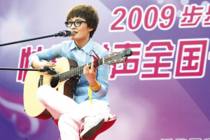 曾:嗯,最初是寫(xiě)歌詞,當(dāng)時(shí)是初三,因?yàn)榭荚噳毫Υ螅妥约和客慨?huà)畫(huà)寫(xiě)出來(lái)了。開(kāi)始有曲譜配歌詞是高三的時(shí)候,會(huì)彈吉他了!秾W(xué)習(xí)×××的日子》(由于她說(shuō)話聲音實(shí)在太綿羊,重復(fù)了3次,記者還是沒(méi)聽(tīng)清楚歌名),是一首校園歌曲,這是第一首完整的歌,也是完整的曲,就為了鼓勵(lì)考英語(yǔ)專(zhuān)業(yè)四級(jí)的人們,加油、努力,只唱給自己的朋友聽(tīng)過(guò)。大家覺(jué)得,還行吧。