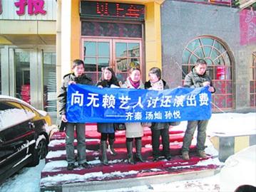 昨日上午,沈陽(yáng)一文化公司的5名員工在北三經(jīng)街鬧市區(qū)拉出條幅:“向無賴藝人討還演出費(fèi)!”條幅下列出了三名藝人的姓名:齊秦、湯燦、孫悅。