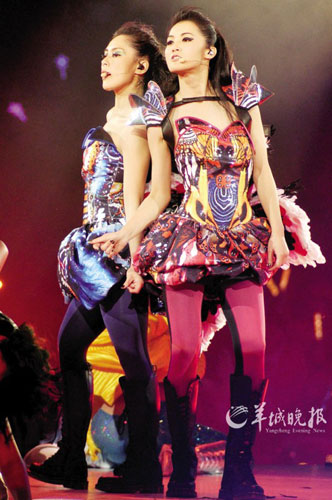 前晚的演唱會(huì)場面相當(dāng)華麗,TWINS一共換了五套華服,每套都以不同的主題場景配襯,絕對(duì)凸顯“女人味”。一開場,兩人以“冰雪女王”的科幻裝束亮相,取“破冰重出”之意;接著是“小蜜蜂”昆蟲造型,寓意“辛勤勞作望有所獲”;然后是“絢麗大花”小短裙,顯示兩人如花般“美麗綻放”;還有“芭比娃娃”俏麗打扮,取意“依然經(jīng)典可愛”;第五套服裝是夸張“鹿角”配黑白短裙,在《下一站天后》的歌聲中再次展開對(duì)“天后夢”的追逐……直到返場時(shí),她們才換回樸素的灰色短裙,裙子上印著她們此次演唱會(huì)各自的造型,似乎又回到了現(xiàn)實(shí)。