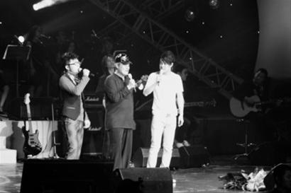 而師父趙本山和師弟小沈陽的陸續(xù)登臺獻唱,更是掀起高潮。小沈陽狂飆高音現(xiàn)場演唱了《三槍拍案驚奇》的主題曲《我只是個傳說》,隨后師兄弟倆合唱了一首《我的好兄弟》。之后師父趙本山的登臺讓全場觀眾報以雷鳴般的掌聲。趙本山身著黑色休閑裝酷勁十足,現(xiàn)場用調侃的方式介紹了所有樂隊成員,逗的臺下觀眾前仰后翻。