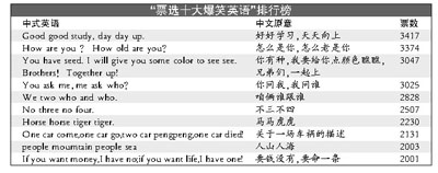 “票選十大爆笑英語(yǔ)”今晨出爐,“Goodgoodstudy,daydayup”(好好學(xué)習(xí),天天向上)以3417票高居榜首,成為最受歡迎的中式英語(yǔ)。