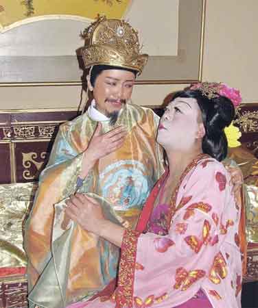 中新網(wǎng)3月20日電 歐陽(yáng)震華(Bobby)與鄧萃雯前晚為劇集《尖子攻略》開工,穿肚兜刻意露點(diǎn)的Bobby反串扮楊貴妃,雯女則粘須扮唐玄宗皇帝,調(diào)戲身邊的肥貴妃。雯女打趣地說(shuō):“上天如果賜這樣一個(gè)女人給我,我寧愿永遠(yuǎn)做女人。”而梁列唯、袁偉豪、羅仲謙和梁證嘉則反串扮丫環(huán)。