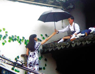 昨日的一場(chǎng)戲,是秦嵐和劇中的兒子吳磊拍對(duì)手戲。由于天氣炎熱,秦嵐說(shuō)雖有洋傘遮陽(yáng),但妝還是化得很快。小演員吳磊當(dāng)天很是不適,拍到最后竟然中暑,又吐又哭,忙壞了劇組的工作人員。按照劇情,秦嵐要從屋頂上往下跳,盡管劇組為她請(qǐng)了替身,但為了追求真實(shí)和進(jìn)度,秦嵐親自上陣,從數(shù)米高的地方往下跳,這場(chǎng)戲總算結(jié)束。