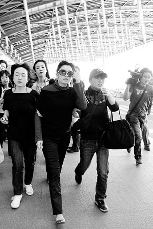 等賈靜雯一走出通道,媒體立即蜂擁而上。其內(nèi)地經(jīng)紀(jì)公司委派的兩名助理,立即上前將其左右護(hù)住。
