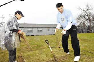 日前,功夫巨星李連杰與中國球員姚明一起出席了美國NBA全明星慈善活動,參加了新奧爾良巨星城的慈善植草皮活動。這個城市在去年遭受到了“卡特琳娜”颶風(fēng)的襲擊,因此這次的全明星球員們不僅僅只是會去比賽,還會幫助當(dāng)?shù)鼐用駛冏鲆恍┐壬频氖虑椤F渲兄袊騿T姚明和著名的功夫巨星李連杰也在這些慈善事情中做出了自己的貢獻(xiàn)。圖為李連杰與姚明一起合作植草皮。