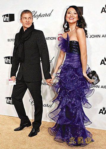 章子怡穿華麗紫色晚裝 與男友攜手亮相慈善晚會