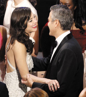 喬治·克魯尼真是越老越頑皮,雖然在強(qiáng)敵劉易斯的壓制之下無(wú)緣影帝,但紅地毯上的他不僅與女友莎拉·拉爾森大秀恩愛,臺(tái)下又熱情地與凱特·布蘭切特寒暄,向新鮮出爐的最佳男配角賈維爾、最佳女配角蒂爾達(dá)、最佳女主角瑪麗昂、最佳男主角劉易斯等人表示祝賀,莫非他真是見誰(shuí)都熟,人見人愛車見車載?