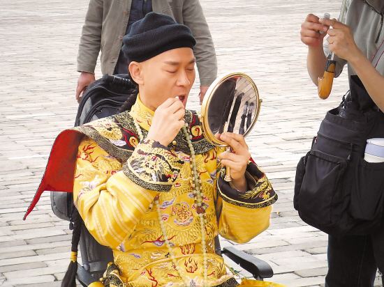 直到下午一點(diǎn),記者遠(yuǎn)遠(yuǎn)地看到太和殿前廣場的御道上,有一大群人簇?fù)碇粋(gè)穿龍袍的人在走來走去。鄭少秋出場了!記者趕快跑過去,卻在半路上碰見了正坐在凳子上休息的鄭少秋,原來那個(gè)只是替身。