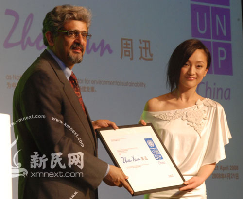 2008年4月22日,新民網(wǎng)記者從周迅經(jīng)紀(jì)公司華誼了解到,周迅被聯(lián)合國(guó)開發(fā)計(jì)劃署任命為中國(guó)首位親善大使,將與羅納爾多、齊達(dá)內(nèi)和莎拉波娃等體育明星在各自領(lǐng)域從事慈善、環(huán)保工作。任命儀式上,周迅表示,為了呼吁環(huán)保,她將不再泡澡。