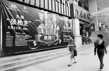 記者核實(shí):昨天下午2點(diǎn)多,記者在江濱路新時(shí)代影院樓下的千度酒吧門口看到了吳先生說(shuō)的廣告。在千度酒吧門口右側(cè)的一副海報(bào)上,寫著“大陸張柏芝”、“大陸陳冠!币约皟扇说恼婷拖嚓P(guān)簡(jiǎn)介,中間顯要位置是兩人照片和“明星零距離”、“艷照門”字樣。許多路人從海報(bào)前經(jīng)過(guò)都不禁瞄上一眼。