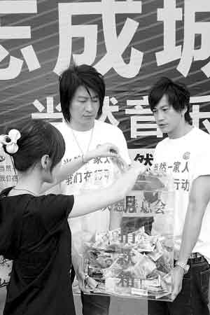 昨天,游鴻明、何潤東、陳怡蓉、沈建宏、鄧寧、劉錫明、阿清、高磊、晨辰等當(dāng)然音樂的歌手抵達(dá)重慶。他們帶著70余萬元的救災(zāi)物資和9顆愛國之心在重慶街頭為汶川地震的災(zāi)后重建募款。在重慶石橋鋪佰騰數(shù)碼廣場、沙坪壩步行街、江北北城天街三個募捐點(diǎn),累計3小時的募款活動中,何潤東等9位藝人共籌集善款187400余元,目前這個數(shù)字還在不斷增加。