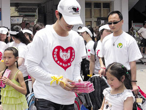 5月16日,在“5·12地震”發(fā)生的第四天,黃曉明帶著醫(yī)療和救援志愿隊(duì)趕到受災(zāi)最嚴(yán)重的遵道鎮(zhèn)、漢旺鎮(zhèn)和死傷人數(shù)最為慘重的東方汽輪廠等地,以一名普通志愿者的身份默默幫忙。昨天,在兒童節(jié)這一天,黃曉明又親自率領(lǐng)自己的愛(ài)心基金會(huì)成員們,二度進(jìn)入重災(zāi)區(qū)綿陽(yáng)安縣的數(shù)所小學(xué),給孩子們帶去急缺的生活學(xué)習(xí)用品。本報(bào)記者昨天也全程陪同,見(jiàn)證了這位將慈善視之“習(xí)慣”的明星的真性情一面。