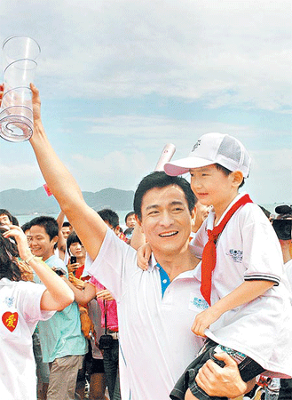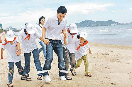 中新網(wǎng)6月6日電 據(jù)臺灣媒體報道,劉德華(華仔)日前帶著80名災(zāi)區(qū)小朋友,參加在海南島三亞灣舉辦的“汶水入海”四川賑災(zāi)活動。華仔與小朋友玩起5人6腳在500米長的沙灘上進(jìn)行接力傳遞,華仔最后還抱起1名災(zāi)區(qū)小朋友,將象征愛心與祝福的汶川之水舉起倒入大海,完成儀式。