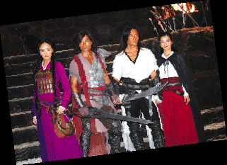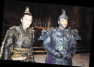 走進(jìn)一間已經(jīng)被布置成刑房的攝影棚,巖石碎塊構(gòu)成了粗糙的地面,幾把劍插成了劍壇,臺(tái)階上火爐冒著火苗,空中還懸著幾塊爬著蟲蛆的火腿,幾臺(tái)鼓風(fēng)機(jī)正開足馬力吹著風(fēng)……看前面,一堆人正在你推我一把,我攻你一招,原來替身正在幫任達(dá)華試戲。對(duì)披著長(zhǎng)發(fā)造型的鄭伊健、郭富城以及何家勁來說,炎熱恰是專門跟耍帥作對(duì)的。問到郭富城對(duì)于造型的看法,郭富城當(dāng)即冒出一句“非常熱”,F(xiàn)場(chǎng)汗流浹背的阿Sa抱怨說,飾演聶風(fēng)的鄭伊健可謂是片中最舒服的一位,不僅戲服相對(duì)清涼,由于名為“風(fēng)”,因此拍戲的時(shí)候可以充分享受鼓風(fēng)機(jī)的待遇。