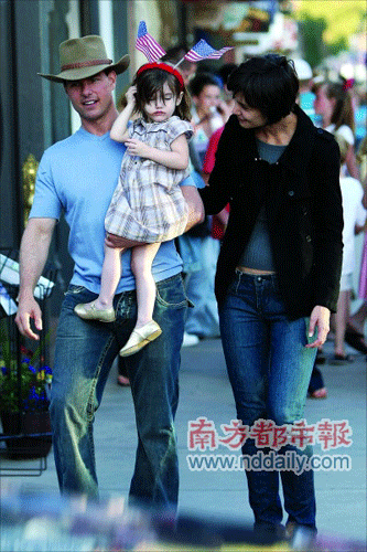 阿湯哥生于1962年7月3日,美國(guó)國(guó)慶日那天正好是他46歲生日的第二天。他一身西部牛仔裝扮,抱著寶貝女兒蘇瑞走在大街上,不時(shí)向圍觀的粉絲打招呼,也任身邊的狗仔隊(duì)拍照。然而,當(dāng)天的明星卻不是阿湯哥,而是他懷里2歲的小蘇瑞。蘇瑞戴著一個(gè)紅色發(fā)卡,上面插著兩面美國(guó)國(guó)旗,造型十分趣怪。尤其當(dāng)她在明星老爸懷里揮舞雙臂的時(shí)候,是街上十足的焦點(diǎn)人物。媽媽凱蒂一身黑衣十分低調(diào),她不時(shí)低頭跟女兒說(shuō)話,有時(shí)也主動(dòng)向在場(chǎng)的狗仔隊(duì)?wèi)c!皣(guó)慶快樂(lè)”。