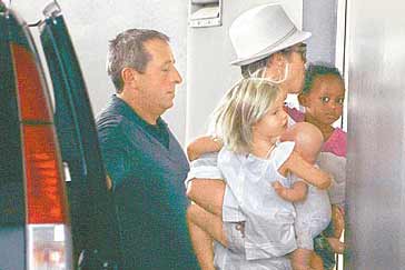 皮特(左三)日前抱兩個女兒到醫(yī)院看茱莉,保鏢(左一)在旁護(hù)駕。
