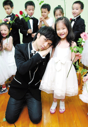 近日,古巨基為EMI特別企劃的國語新專輯“《小甜蜜》百人愛情見證”活動專程前往托兒所挑花童。面對三四歲的小朋友,古巨基穿了一套看似正式的西裝,領結卻是一只小黑狗的造型。超級喜歡小朋友又很想當爸爸的基仔,不管說什么都能讓小朋友開心大笑,功力不輸兒童節(jié)目主持人。他一句童音版的“我是古巨基啊”也引起小朋友的調侃,“你是古基基!”他開心地表示:“如果以后我有了小孩,我有信心一定可以當他最好的朋友!”