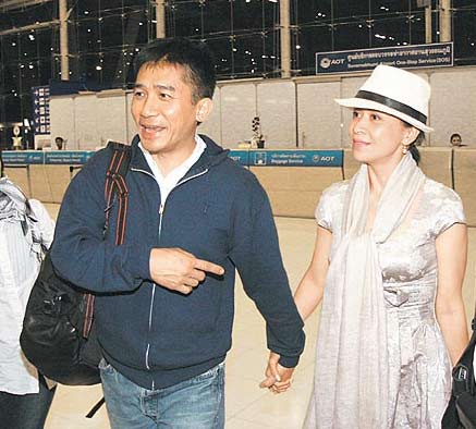 偉仔(左)牽著劉嘉玲抵曼谷機場,準新人臉上洋溢幸福。
