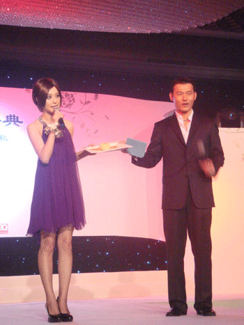當(dāng)晚,女星范冰冰著一身紫色露背晚裝壓軸登場。范冰冰稱自己此次設(shè)計(jì)的冰淇淋月餅是特意為奧運(yùn)健兒劉翔所做。她說,劉翔的名字里有個(gè)“翔”,所以在這個(gè)冰淇淋月餅原有的基礎(chǔ)上加了一對翅膀,希望這個(gè)跑得最快的天使,在今年北京奧運(yùn)會(huì)上能再次奪冠,也祝福所有正在為奧運(yùn)正在忙碌的人們。