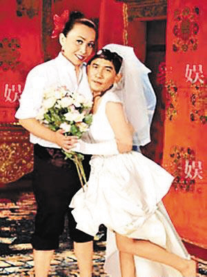 有網(wǎng)友就把兩人的結(jié)婚照惡搞一番。其中在不丹王宮拍攝的一幅,慘被網(wǎng)友變性,偉仔身穿婚紗依偎新娘,嘉玲則很新郎地攬著對方。