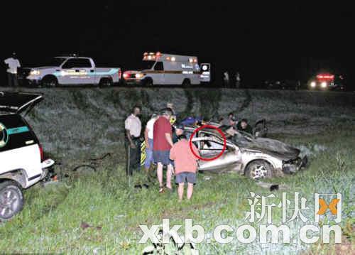 禍現(xiàn)場,摩根駕駛的車輛嚴重變形,救護人員正在搶救摩根。