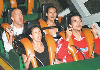 布魯斯·威利斯(后排左)與前妻黛咪·摩爾(前排左起)、她的現(xiàn)任老公艾希頓·庫奇乘云霄飛車玩得不亦樂乎。