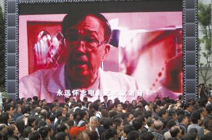 龍華殯儀館的大廳外掛著四幅謝導的大型肖像,都是謝導生前工作生活時的日常照,另外一邊高達四米的巨型屏幕則不斷播放著《紅色娘子軍》、《天云山傳奇》等謝導生前作品的片段。影迷們駐足其下,回憶著謝晉帶給他們的感動,久久不愿離去。