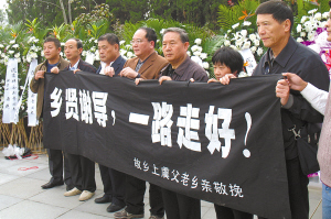 “鄉(xiāng)賢謝導,一路走好!”昨日,為送謝晉最后一程,謝晉家鄉(xiāng)——上虞的父老鄉(xiāng)親們也專程派代表來到上海。“謝晉是我們的驕傲,他一生都在用電影為底層人民說話,F(xiàn)在他走了,但我們一定會把他的電影夢想繼續(xù)下去。”這位謝晉的老鄉(xiāng)說。