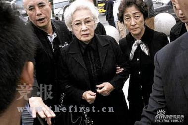 大廳內(nèi)的墻上掛著謝導(dǎo)的遺像,謝晉的遺體邊遍布鮮花,老人戴著眼鏡,就好像睡著了一般,旁邊還放著他最鐘愛的一頂帽子。一點十分左右,謝晉妻子徐大雯和其小兒子阿四到達追悼會現(xiàn)場,強掩住內(nèi)心的悲傷,送謝導(dǎo)最后一程。這幾天,徐大雯堅持從醫(yī)院出來,親自參與布置靈堂,盡管她剛剛安裝了心臟起搏器,精神狀態(tài)很不好。徐大雯這些天說得最多話是:“我不能倒,這個家總得有一個人撐著!弊蛉,一直表現(xiàn)堅強的徐大雯顯得非常憔悴,頭發(fā)花白,走路蹣跚,對著謝晉的遺體說了不少話。