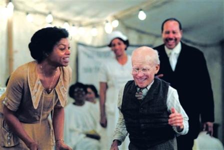 《本杰明·巴頓奇事》是一部劇情怪誕的影片。影片的男主人公是個(gè)叫本杰明·巴頓的怪人(布拉德·皮特飾),他一生下來(lái)就是個(gè)滿(mǎn)頭華發(fā)、一臉褶子的古稀老頭(劇照中皮特的體型很小,估計(jì)是個(gè)“老嬰兒”)?善婀值氖,他的生物鐘是倒著走的——?jiǎng)e人越活越老,他卻越活越小。巴頓1919年出生,不經(jīng)意間愛(ài)上了一個(gè)名叫黛西的6歲女孩,30年后,兩人終于“長(zhǎng)”得年齡相仿了。他們彼此相愛(ài),度過(guò)了人生中最美好的一段時(shí)光。皮特在化裝和特效的幫忙下,變成了一個(gè)貌似被風(fēng)干的小老頭,形象十分驚人,與壯碩的皮特判若兩人。 欣聞