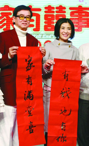 香港喜劇經(jīng)典《家有喜事》系列時隔11年后推出的《家有喜事2009》定于明年1月28日大年初三上映。影片主演黃百鳴、吳君如、姚晨、郭濤以及導(dǎo)演谷德昭等出席了昨日的發(fā)布會。該片是吳君如生子后接演的首部電影,不過她表示已有意減產(chǎn),多留時間給家人。盡管老公陳可辛已提出想與自己合作新片,但是吳君如透露因?yàn)樽约翰粫䴗p片酬,所以還是希望老公多去賺外快。