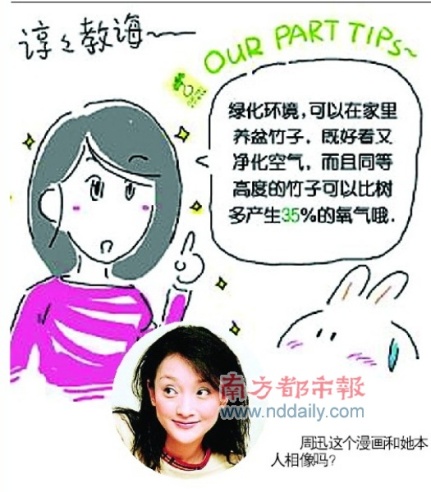 周迅日前推出“周粥”合作———和國(guó)內(nèi)當(dāng)紅漫畫(huà)家胖兔子粥粥合作漫畫(huà)專欄,推廣環(huán)保意識(shí)。