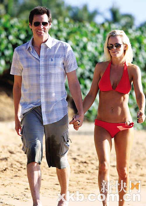 近日,好萊塢喜劇男星金·凱瑞和他的女友詹妮·麥卡錫一起在夏威夷的海灘上度假,兩人手牽手走在沙灘上,不時激情擁吻,十分親密。36歲的詹妮·麥卡尼身穿橙色比基尼,展示了她完美的身材。