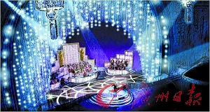 在這座紐約建筑師大維·洛克威爾設(shè)計(jì)的紫藍(lán)色舞臺(tái)上,裝飾異常華麗,天花板上垂下的吊燈也閃閃發(fā)亮,為舞臺(tái)增添幻想色彩。洛克威爾對(duì)此表示滿意,認(rèn)為這就是他設(shè)計(jì)概念中的那個(gè)“超現(xiàn)實(shí)風(fēng)格的舞臺(tái)”。