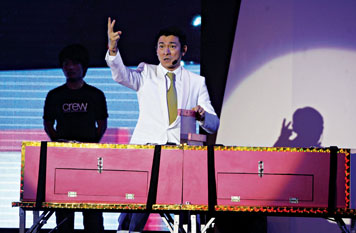 劉謙變魔術(shù),那是他的老本行,而劉德華就純粹是客串了,但在舞臺(tái)上的一招一式,劉德華倒并不業(yè)余。第一個(gè)魔術(shù)請出了他的“女朋友 ”:“她是我今天的女朋友哦。”邊說邊摸著美女的手,“為了公平起見,我要邀請媒體朋友一起來參與!薄斑有你,美女,我喜歡漂亮的……”還沒開始變魔術(shù),之前的噱頭已擺得夠足。“將美女關(guān)在盒子里,用鋒利的刀等工具往下插,然后盒子分離,人也就此被分尸……”表演內(nèi)容并不陌生,但出自華仔之手,粉絲們看得津津有味,尖叫聲不斷!華仔究竟用了多少時(shí)間學(xué)會(huì)變這個(gè)魔術(shù)的呢?“這個(gè)是秘密,不能告訴你們。”故作神秘的華仔透露說,自己曾經(jīng)上過劉謙的節(jié)目,也跟他學(xué)了幾招。